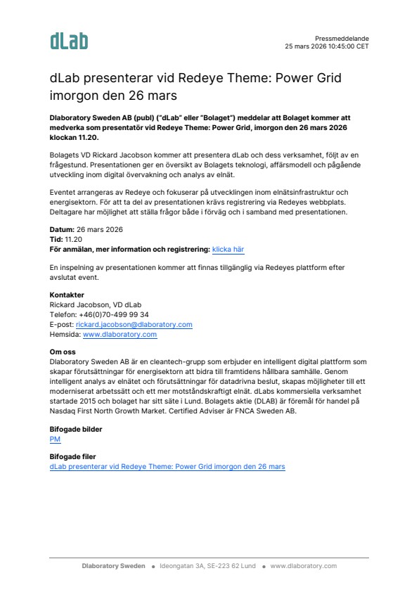 Dlaboratory Sweden AB (publ) (”dLab” eller ”Bolaget”) meddelar att Bolaget kommer att medverka som presentatör vid Redeye Theme: Power Grid, imorgon den 26 mars 2026 klockan 11.20.
