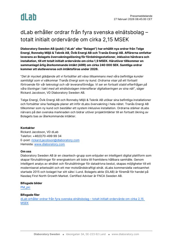 · Den 6 november meddelades att dLab erhållit fyra nya ordrar från svenska elnätsbolagen Karlshamns Energi, Ronneby Energi och Miljöteknik, Öresundskraft samt Kraftringen. Affärerna omfattar leverans av övervakningslösningar för fördelningsstationer till ett totalt värde om cirka 3,5 MSEK, samt en årlig återkommande intäkt (ARR) om 421 000 SEK.