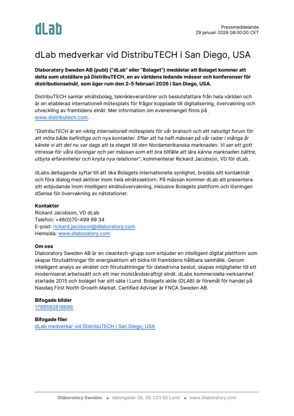 Dlaboratory Sweden AB (publ) (”dLab” eller ”Bolaget”) meddelar att Bolaget kommer att delta som utställare på DistribuTECH, en av världens ledande mässor och konferenser för distributionselnät, som äger rum den 2–5 februari 2026 i San Diego, USA.